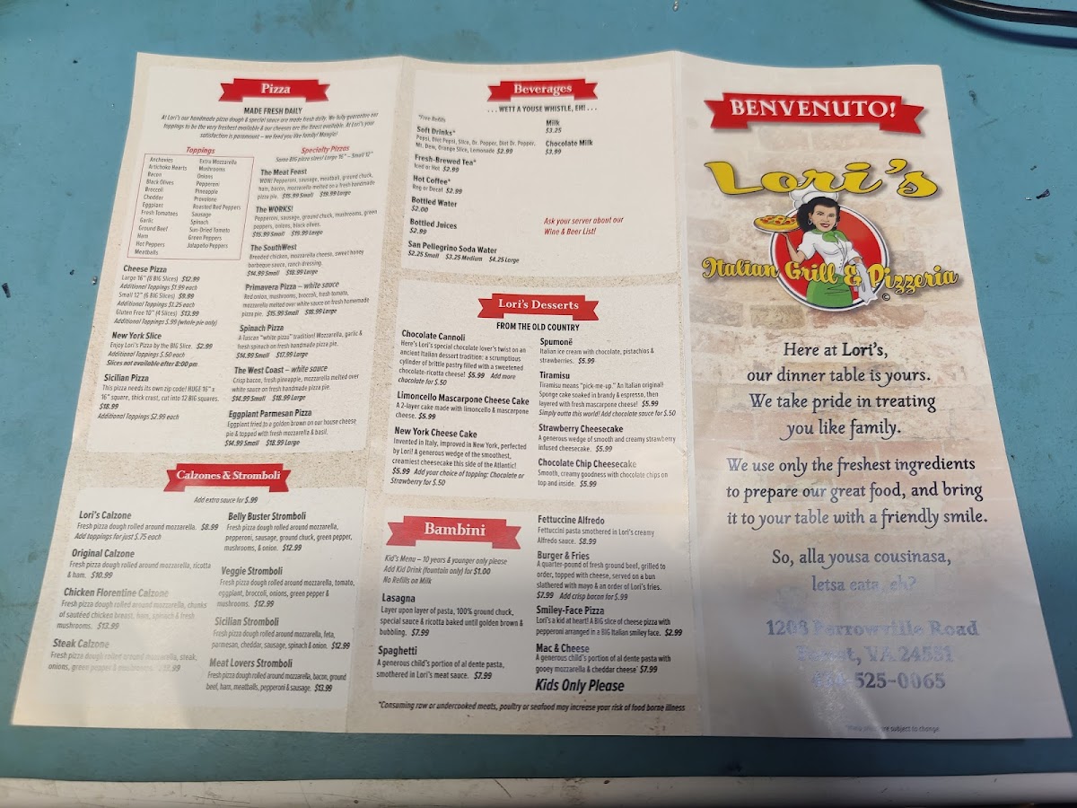 Lori's is a beloved pizza destination nestled in Forest, VA, renowned for its commitment to quality and flavor. Featuring an impressive lineup of specialty pizzas, including The Works and the Sicilian Pizza, Lori's caters to every pizza lover's palate. Beyond pizza, the menu shines with delicious pasta and fresh, homemade dishes, consistently praised by locals. Customers rave about the welcoming atmosphere and attentive service, making it a perfect spot for family gatherings or casual dinners. With fresh ingredients at the heart of every dish, Lori's has established itself as a go-to culinary gem in the community.